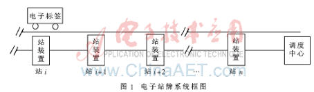 本文所述电子站牌系统框图如图1所示,主要由位于车站的站装置、安装或贴于车上的电子标签、电力线及调度中心组成。