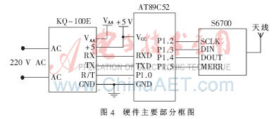 硬件电路主要部分框图如图4所示,主控制器选择Atmel的AT89C52单片机,标签阅读器主芯片选择TI的S6700多协议收发芯片,电力载波收发部分选择科强电子的KQ-100E的电力载波收发模块。