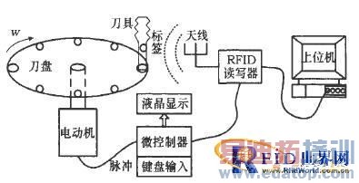 本系统硬件工作平台的结构组成主要包括:刀库工作系统、射频识别系统、上位机管理软件和便携式微控制器。其中,刀库系统选用圆形刀盘回转装置,由步进电动机驱动运行,硬件工作平台如图1所示。