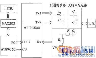 系统电路图主要包括3个部分:MCU处理器、RC500内部电路和外部电路。MCU与RC500为并行连接AD。RC500内部电路主要包括发送部分、数字部分以及8位并行口。外部电路包括一个低通滤波器、接收电路、天线匹配电路和天线。低通滤波器根据国际电磁兼容性(Electro Magnetic Compatibility,EMC)条例对发射波中更高的谐波进行滤除,由元件L1和C1。组成。接收电路由元件R1、R2、R3和R4组成。RC500内部产生的VMID电势作为腿脚的输入电势,两者之间连接一个分压器,在VMID引脚处再接一个对地电容c3提供稳定的参考电压。天线匹配电路由元件C4、C5组成。刀具射频识别系统主框图如图2所示。