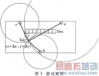如某游客进行人机互动游戏时,设其初始位置为Ini,目标位置为Des,游戏地图由小长方形区域组成,如图3中灰色区域所示,游客根据灰色的游戏地图进行移动,与此同时,系统实时地将解算出的游客位置与游戏设定的地图相匹配,进而完成互动游戏。