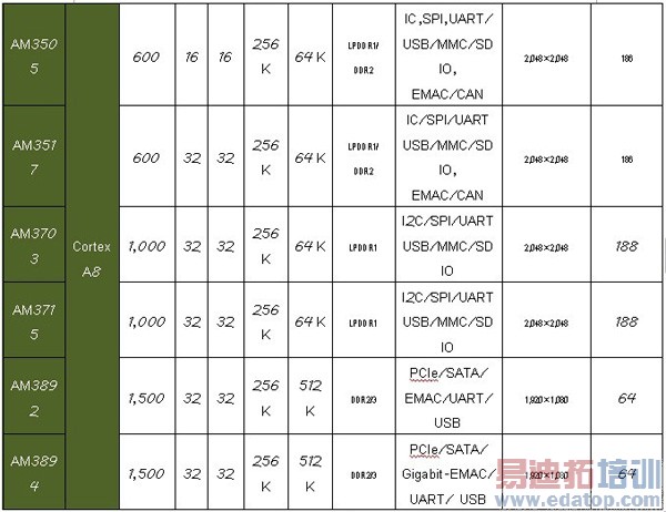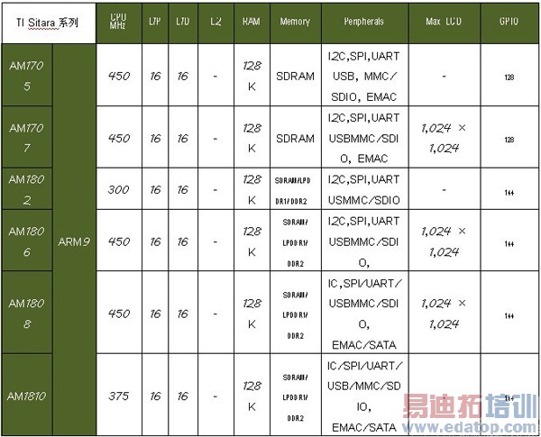 TI面向工业、军用领域主要是Sitara系列嵌入式处理器,见下表。