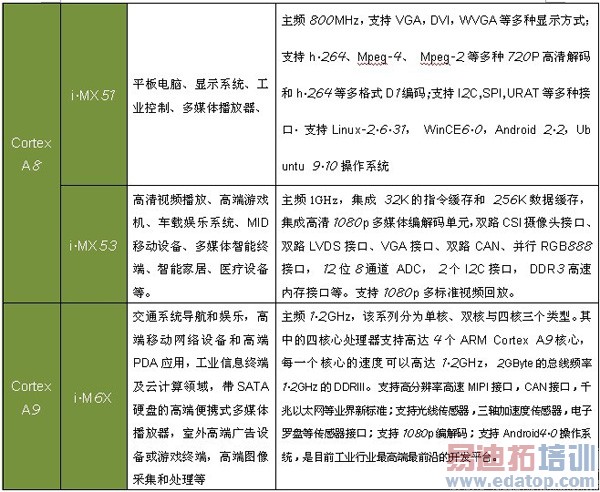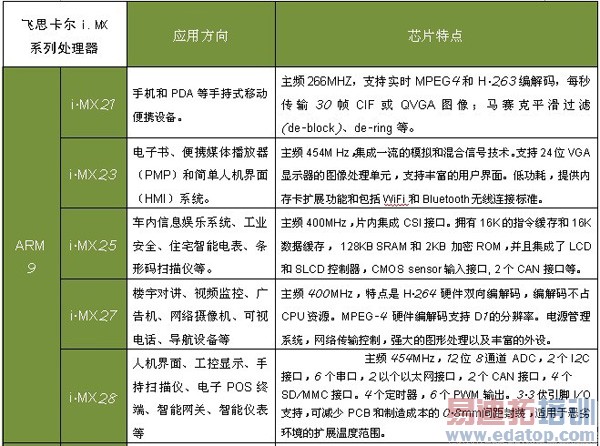 飞思卡尔i.MX系列嵌入式处理器,见下表。