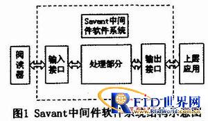 图1模型的基本功能在于其中处理模块通过输入接口模块与输出接口模块与阅读器和上层应用软件进行联系。Savantqp间件系统是一个开放式系统,其用户定义的处理模块是功能实现的主要体现部分,提供各种用户要求的功能。在输入端,Savant中间件系统主要工作是对阅读器所采集到的电子标签信息进行收集和处理,或者根据自身内部设定的命令对阅读器输出反馈指令;在输出端,其面对的是上层应用软件的调用,或者是通过ONS对象名解析服务对PML服务器上的相应商品信息进行读取。