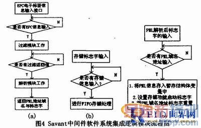 图4(a)逻辑程序块的主要任务集成了过滤功能与解析功能,当完成过滤后,确定该电子标签代码有效,即可进行解析操作,不需要在过滤与解析功能之间添加其他控制变量或控制信息。在完成图4(a)模块后,需要向PML服务器输出解析后的PML域名地址信息,并等待PML服务器返回该电子标签相应商品的具体信息,即进入图4(b)程序模块所代表的存储环节。由于本文采用的FIFO存储模式,需要在新的商品信息存储之前,调整存储空间中已有信息的位置,所以当图4(b)程序模块结束后,具体信息首先暂存在Savant中间件软件系统的另外开辟的存储缓冲区,并应当加入存储控制字,当该控制字有效后,存储空间进行FIFO调整,然后从另外开辟的存储缓冲区中取出待存储的信息存放至FIFO存储空间的最后位。以上即是Savant中间件软件系统的逻辑控制,三部分的逻辑控制流程图如图5所示。