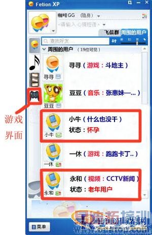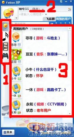 3. 增强型的手机IM软件——文中假为手机平台的“飞信XP”,如下图。飞信XP集成了识别周围用户、听音乐、看视频和玩游戏四大功能(红色标注1)。飞信XP的用户可以修改自己的在线状态(红色标注2),包括在线、隐身、老年用户等,也可以自定义。这些状态将直接影响到手机的应用模式(见后文的各应用场景,如场景一的Tips和场景二)。