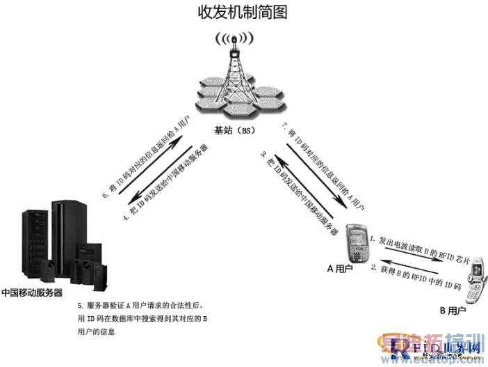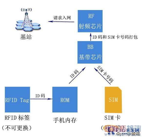 技术原理:见图,新型的采用RFID技术的移动定制手机在每次开机时会同时发射RFID标签记录的ID码和SIM卡号码两个号码(传统的手机只发送SIM卡号码)给移动基站,这两个号码都经过验证后才能入网。当手机用户将已遗失手机的向中国移动挂失时,中国移动会锁住这个号码,以使其无法再正常入网使用。由于RFID标签在出厂前就集成在手机电路上且无法更换,后期想破解手机的RFID标签的行为将被阻止或加大成本。另外,挂失的手机在公共场合出现时,周围的移动手机能通过RFID阅读器侦测到,使公众和中国移动都能监督(原理同收发机制简图)。