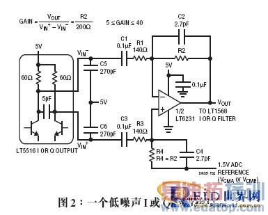图2示出了一款用于把LT5516的差分I或Q输出转换为一个单端输出的LT6231差分放大器。在60Ω电阻器的两端增设270pF外部电容器可把解调器的输出限制为10MHz,以防止任何高频干扰传送至LT6231放大器。