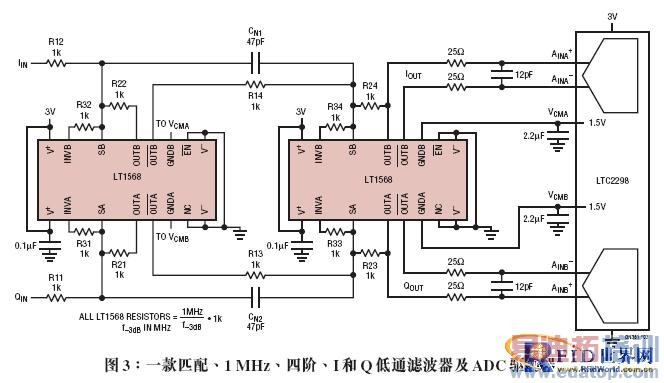 一个匹配的I和Q滤波器以及一个双信道ADC图3示出了两个被连接成双信道、匹配、四阶滤波器的LT1568滤波器单元式部件。LT1568滤波器的单端输入至差分输出转换增益为6dB。LT1568电路利用相等的电阻器阻值实现了一个椭圆低通滤波函数(见图3)。2(f-3dB)条件下的阻带衰减为 34dB。I和Q滤波器匹配由LT1568的A和B侧的固有匹配来保证。