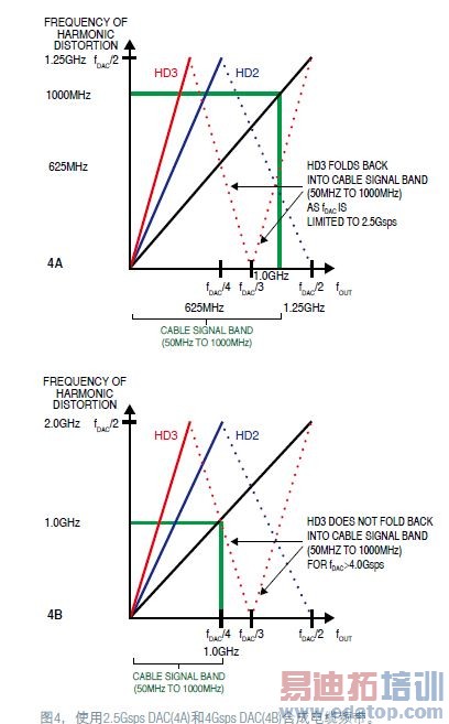 MAX5882以超过4Gsps的刷新速率对1GHz带宽信号进行过采样。注意,根据奈奎斯特原理,同步1GHz频带要求采样率略高于2GHz.但如果使用2.5GspsDAC,由于频率混叠,主要的谐波失真分量(例如2次谐波(HD2)和3次谐波(HD3))会折返至1GHz电缆频谱内(图4A)。这些失真会破坏DOCSIS发送器的带内RF性能。使用4Gsps DAC(图4B)时,HD2和HD3则不会折返到有效的CATV频带。