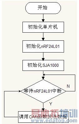 CAN 函数用于将有关数据发送至PC 机。本次设计采用查询方式以确保数据已经发送。通过查询状态寄存器中的标志位TBS、TCS 和TS 即可确认是否数据发送完毕。类似的,在无线函数中为确保数据已经发送,通过查询状态寄存器中的TX_DS 即可。