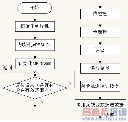 在初始化MF RC500 中,其主要设置如下:TX1和TX2 的输出配置为13.56MHz 能量载波;解码器的输入源为内部解调器;使用Q 时钟作为接收器时钟;禁止发送和接收中断;设置RxThreshold 寄存器值为0xFF,BitPhase 寄存器值为0xAD 等。