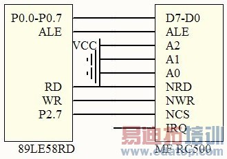 由图6 所示, MCU 将MF RC500 中的寄存器作为外部RAM进行访问。INT 管脚悬空,不使用中断功能。