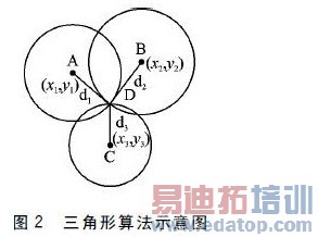 三边定位法:分别以已知位置的3个AP为圆心,以各个到待测标签的距离最近参考标签的距离为半径作圆。所得的3个圆的交点为D.三角形算法示意图如图2所示。