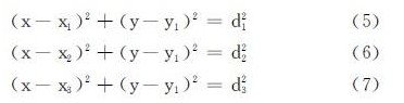 设位置节点D(x,y),已知A、B、C三点的坐标为(x1,y1),(x2,y2),(x3,y3)。它们到D的距离分别是d1、d2、d3.则D的位置可以通过下列方程中的任意两个进行求解。