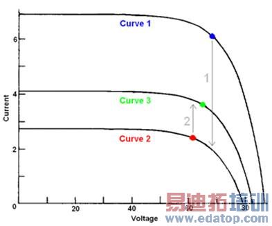 如图 1 中的 ICE 实例所示,使用电子负载在三条 I-V 曲线上执行最大功率点跟踪。电子负载设置为恒压(CV)模式。每条曲线上的彩色点代表该曲线的最大功率点(MPP)。起始点为曲线 1 上的最大功率点(蓝点)。电子负载的 CV 设置为 Vmp,而且我们已测量和存储了该点的电流和电压值。一旦发生变化,便由曲线 1 转到曲线 2。如果现在测量电流和电压,此时电压保持不变(因为该电子负载是恒压模式),但是电流会发生变化,因此可知我们已不在最大功率点上。由于电子负载是恒压模式,我们现在处在灰色箭头“1”所指的曲线 2 的相应点上。通过下列关系式,我们可知道应选择什么方法来找到新的最大功率点:如果 dI (使用 dI ≈ ∆I = In – Ip 来估算)是负值,则我们现在处于最大功率点的右侧,需要向左侧移动(降低 CV 设置),反之,如果 dI 是正值,便进行相反的操作。在此实例中,由曲线 1 移到曲线 2,dI 将变成负值,因此需要降低 CV 设置以便找到新的最大功率点。我们可通过设置某个电压步长(称为 Vinc)来降低 CV 值。现在,我们将处在一个不同的电压和电流电平上,所以需要使用这两个参数来决定下一步的操作。由于刚才在曲线 2 上向最大功率点移近了一些,那么 dP 是正值而 dV 为负值,因此仍需向最大功率点的左侧移动。继续增加 CV 设置直到 dP 值等于零,这意味着该点将不再有斜率(实际上不可能达到 dP=0,但稍后将解释这个问题)。达到曲线2 的最大功率点之后,我们将转向曲线 3,那么我们现在位于灰色箭头“2”所指的曲线 3 上。因为电压仍保持不变,我们需要再次通过测量电流变化来检测所发生的变化。这时 dI 是正值,因此可知现在我们处于最大功率点的左侧,需要通过 Vinc 增加恒压(CV)设置(移向曲线的右侧),来找到最大功率点。