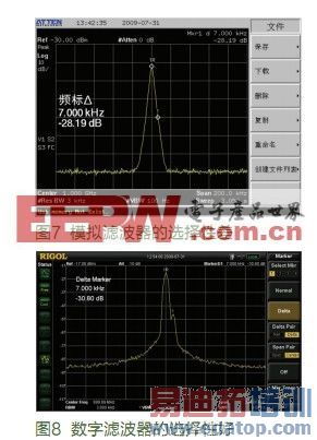 此外,数字滤波器的形状因子可以做得更小,从而以前被掩埋在大信号裙带下的小信号采用更好选择性的数字滤波器之后得以凸现。选择性是60dB带宽与3dB带宽的比值。DSA1030A的中频滤波器选择性为5,远远优于模拟滤波器的15。如图7和8。采用数字滤波器的DSA1030A更容易分辨两个相距9kHz,幅度相差30dB的信号。