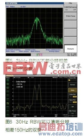 2.采用全数字中频技术可以分辨更近的信号:通过实现更小带宽的中频滤波器,可以分辨频率相差只有10Hz的两个信号。最小分辨率带宽是用来说明频谱仪能分辨两个幅度相当而频率相差很小信号能力的指标。越小的分辨率带宽就可以分辨距离越近的信号。例如输入一个两个频率相差150Hz的双音信号,使用30Hz的RBW可以轻易分辨,而3kHz的RBW则不能办到。图5和图6所示。分辨率带宽是指中频滤波器下降3dB处的带宽。