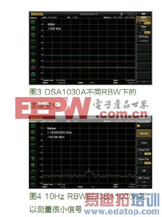 1. 采用全数字中频技术可以测量更小的信号:通过实现更小带宽的中频滤波器,大幅度降低了显示平均噪声电平。DSA1030A实现了最小10Hz的RBW,而要实现这么小带宽的模拟滤波器技术上是很困难的。如图3所示,当设置更小的RBW时,频谱仪的本底噪声也将相应降低(VBW都选择10Hz,同时扫描时间都选择自动),降低大小可以用公式(1)说明。如果RBW从10kHz修改成1kHz,则底噪将下降10dB。DSA1030A在内部标配的前置放大器打开之后,选择10Hz的RBW,可以测量达-148dBm的信号,如图4。