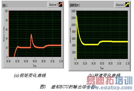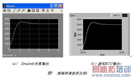 以转速n为5000 r.min-1,Pm为43 kPa,点火提前角θ为9°下为例,Simulink系统仿真结果输出波形与虚拟ECU标定系统实际输出的波形相似,误差较小。图7为参数转速的比较图,其中图7(a)为Simulink输出,图7(b)为虚拟ECU输出。