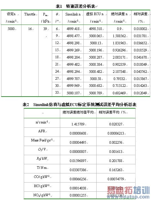 表1为发动机转速为5000 r.min-1,进气压力Pm为39 kPa的稳态工况数据(以参数转速为例),进行10种点火提前角下的标定,然后与Simulink 软件在环仿真数据比较的误差分析。