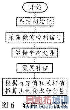 图6为软件设计流程。检测系统在初次安装或检测的物料品种变换时,需要进行系统水分标定和参数的设置,一般需要标定2或2个以上数据点,根据标定值进行数据拟合处理。系统初始化完成后,数据采集模块每采集一小段微波信号,对这段数据进行平滑处理。采用冒泡法先进行排序,选用中间的数据加权平均,并对采样数据进行温度补偿。水分值推算模块根据事先的标定值和平滑预处理后的结果,通过线性匹配算法推算出粮食水分含量值并实时显示。