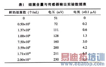在前期研究的基础上,本文对于有关文献中的试验数据进行了信息采样与数据处理,同时进行了微生物快速检测仪的设计制作。表1所列是卢智远等人在其文献中给出的25℃时的鲜牛奶细菌含量与传感器的试验数据。
