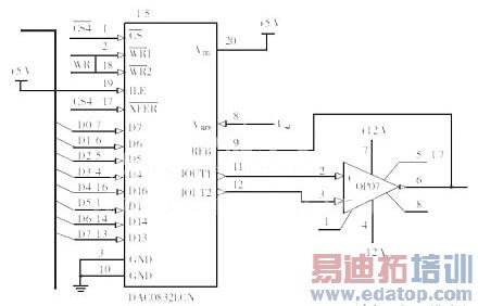 D/A转换器DAC0832是8位二进制数模转换器,8个数字量输入端分别为DI7~DI0,其中DI7为MSB,DI0为LSB.它的模拟量输出端为电流输出IOUT1和IOUT2,当输入的数字量最大时,IOUT1端输出的电流最大;当输入的数字量为零时,输出电流最小。IOUT2端的电流输出情况正好相反。这两个端子可以和外部的运算放大器相接实现电流/电压的变换。此芯片内部还有1个反馈电阻,可以作为外部运算放大器的反馈电阻,DAC0832测试原理图如图3所示。芯片内有两级输入寄存器,使之具备双缓冲、单缓冲和直通3种输入方式,以适于各种电路的需要,例如要求多路D/A异步输入、同步转换等。
