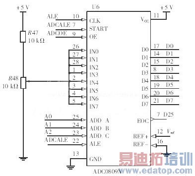 模数转换器ADC0809的测试电路图如图2所示。根据测试电路,ADC0809的8个通道输入同样的模拟量,该模拟量同样也输送给MAX197.控制器选择ADC0809的1个模拟通道,并发出启动转换信号,使ADC0809开始转换,然后控制MAX197也开始转换。等待转换结束,分别读取两者的转换结果,并进行数值比较,根据误差限确定器件功能是否正常。改变通道继续测试,直到8个通道测试完毕,显示其结果。