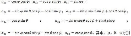 分别为地磁场水平分量和垂直分量;A为任意姿态下测量船坐标系与地磁坐标系的转换矩阵;向量 为各种固定干扰量的合成。矩阵A各元素表达式分别为: