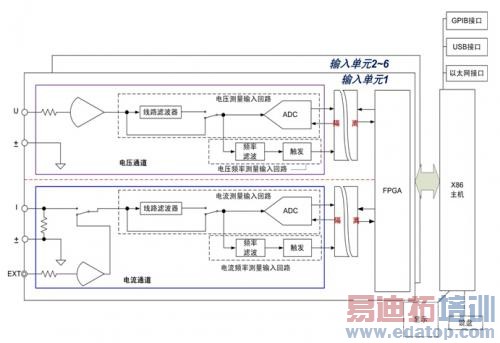 功率分析仪需要与普通电力测量的仪器的最大区别是需要同时测量多路的电压和电流信号,并且各测量通路之间必须进行隔离浮地,隔离耐压达到几千伏以上。采集板卡的框图如下图,隔离耐压达到5kV,由于采用了严格的隔离,所以可以很好的满足各种接线应用,保证接线和用户的安全。