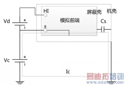 模拟前端浮地可以起到很好的隔离和安全效果,但是由于浮地的存在,导致模拟前端的屏蔽壳地和机壳大地之间存在共模电压Vc如下图所示。被测电压Vd,屏蔽壳和模拟前端地连接在一起,由于被测信号Vd是浮地,所以Vd和大地之间存在Vc这个共模电压,由于模拟前端浮地,所以共模电压Vc加在屏蔽壳和机壳之间的这个杂散电容Cs上,因此该Cs的值直接影响到共模电流Ic的大小,Ic流经被测信号的负端,该共模电流加在负端的输入阻抗上就将共模电流转换成差模电流,从而导致对被测信号的干扰,导致测量不准确,所以实际应用中应该尽量降低共模电压Vc的值,仪器设计上要尽量降低Cs这个杂散电容的值。