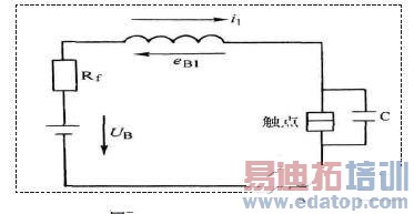 下图为初级电路等效电路图,由电源(蓄电池),电阻,点火线圈的初级绕组,触点和电容组成。具体工作过程为:当触点闭合时,初级电流通过电源,附加电阻,再流过点火线圈的初级绕组,其中初级电流的增长方式是按照指数规律而增长的,并且初级电流存在极限值,这个极限值约为UB/R.在初级电流不断增长的同时,初级绕组中产生自感电势,次级绕组相应产生电势,大小为1.5KV到2KV,但是这个电势不足以击穿火花塞的间隙。