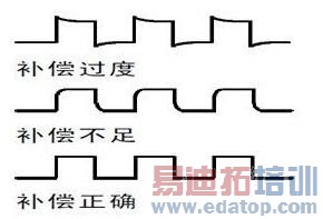 3.如果波形不正确,请调整探头。如下图三所示,直至波形为上面的补偿正确波形。