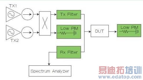 在图3中,通过将信号分别从被测器件的两端注入,可以进行三阶互调的传输测试或者反射测试。Tx1代表了来自发射频段的大信号,Tx2代表了任何可与Tx1混合并在接收频段产生无源互调产物的信号,如在二阶情况下,IM=Tx1-Tx2.