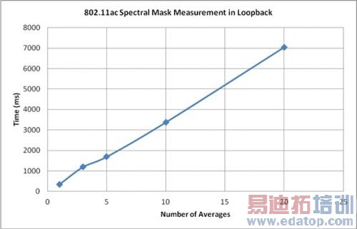 图14. 80+80 802.11ac信号的频谱屏蔽测量测量速度所有测试工程师都面临缩减测试时间的挑战。在特定环境中,工程师需要保证新产品的稳定测试流程。在生成环境中,测试工程师需要以最快时间测试尽可能多的参数。 PXI平台可为仪器以及使用的处理器提供模块化方法,测试工程师提高测试速度的最简便方法就是使用最新最快的处理器。在传统箱式仪器中尝试升级处理器将会十分困难。工程师们很大程度上依赖于仪器制造商来提供最新的处理器。通过PXI系统,工程师自己即可购买高性能计算机来执行所有处理计算。 NI射频仪器已在主控计算机中实现所有调制/解调以及处理计算,该主控计算机可以嵌入PXI机箱或者使用由PXI系统控制的外部计算机。 图15显示了在802.11ac中使用不同平均数执行EVM和频谱屏蔽测试所需的测试时间。