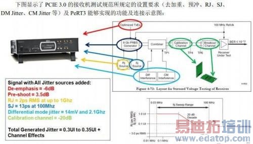 下图显示了PCIE 3.0 的接收机测试规范所规定的设置要求(去加重、预冲、RJ 、SJ、DM Jitter 、CM Jitter 等)及PeRT3 能够实现的功能及连接示意图: