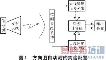 方向图的自动测量与手动测量原理相同,不同的是利用电子和计算机技术,实现了数据采集、处理和方向图绘制的自动化。图1是某雷达天线方向图自动测试的实验配置。