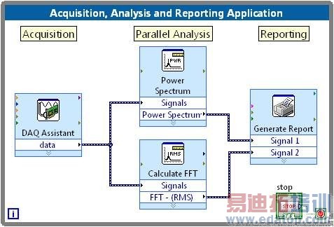 图2. NI 测试管理软件 有些公司已经编写了自己的测试执行程序,并花费了相当大的工程资源来重新开发测试管理软件。这种战略往往导致生产力下降、长时间软件维护带来的资源 紧缺。相反,如果使用市场上现成可用的测试管理软件,如NI TestStand,将让您减少设备常见功能的开发,使您专注于每个设备不同操作的测试代码,从而最大限度地提高生产效率。 测试开发语言: LabVIEWNI Teststand可以调用几乎所有语言所编写的程序,包括:LabVIEW、NI LabWindows/CVI、C/C++、 .NET 甚至脚本语言。然而,大部分的通用编程语言并非针对测试测量应用而优化,因此很难写出具有与仪器通信、分析数据以及按照有意义的方式展示数据等功能的程序代码。 LabVIEW是一种直观的图形化编程语言,帮助程序员或者非程序员开很快地开发强大的测试应用软件。图3所示为一个简单的LabVIEW VI(虚拟仪器或程序)的范例,它可以用来从一个仪器采集信号,对数据进行分析,然后将结果生成报表给用户。