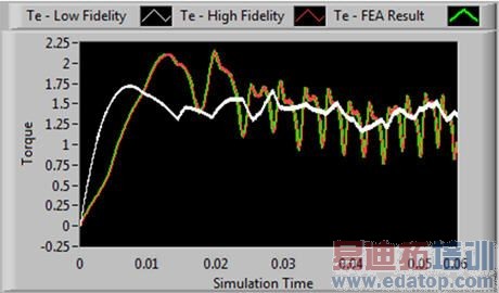 图3. 扭矩计算中包含了D-Q模型、离线JMAG模型和JMAG-RT模型,D-Q模型对扭矩的平均值进行仿真,而JMAG与JMAG-RT模型对扭矩失真进行仿真。 在FEA仿真中,电机模型极其精确,且具有高精度,可充分体现电机中的非线性 。然而,这种高精真的仿真耗时严重,之前来说还是天方夜谭。设计工程师们不得不测量电机参数,并在后处理过程中进行数据分析。 对于复杂的电机模型,该过程需要花费数个小时。NI与JSOL公司合作,借助其FEA工具、JMAG和JMAG-RT,可生成高精度模型,再搭配使用NI LabVIEW系统设计软件和NI VeriStand软件来配置实时测试应用程序,最终完成验证任务。 通过这样的方式,NI满足了电机测试和仿真中的主要需求。现在您可以使用LabVIEW FPGA和基于FPGA的NI RIO硬件,从而以微秒的速度运行FEA电机模型。这些模型可精确地仿真复杂的非线性行为, 然后您就可以将在FPGA中运行的模型连接至其它硬件,以高I / O速率进行完整测试。 用于NI VeriStand的JMAG附加软件NI VeriStand是基于配置的软件环境,可用于创建实时测试应用。其即买即用的特点可帮助您进行实时目标主机通信、数据记录、激励生成,以及报警检测和响应。NI VeriStand从仿真测试到HIL测试的转换相当快速,可让您复用测试组件,包括测试文件、预警、步骤和分析程序等。您可以轻松地重新映射模型、硬件通道等参数,以促成真实I / O。如此简单的转换能够节省您的回归测试时间,并帮助您使用NI TestStand等测试执行软件完成自动化测试。 NI VeriStand具备开放的框架,可通过实时插件创建特定应用功能,这为测试系统提供了最大的灵活性。您可以借助NI VeriStand的JMAG附件在HIL测试中运行具有高精度的实时模型。它能够启动内联FEA仿真,将分析时间从几小时缩短至微秒。您还可在NI PXI实时控制器上运行具备中等精度的FEA模型,其仿真步长约为20至30μs。在基于NI RIO的FPGA上运行FEA模型,可实现对仿真度要求极高的应用程序。这些基于FPGA的模型的步长可低达1µs。JMAG电机模型库拥有各种不同类型的电机,可与多种电机型号进行匹配。您能够将可定制度高的模型修改成特定的电机类型,从而避免创建自定义模型。