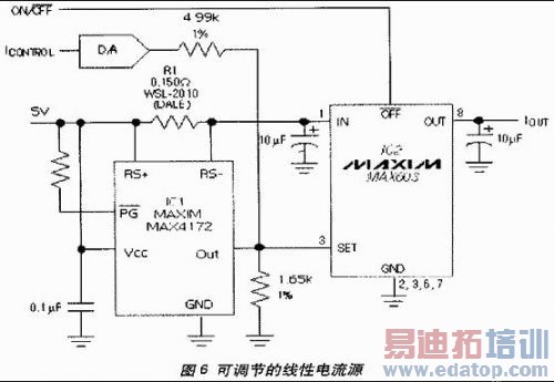 可调节线性电流源(图6)是利用高端电流检测器构成的一个典型应用电,IC1 将R1 电流转换成相应比例的电压信号,控制稳压芯片IC2 产生一个稳定的输出电流,D/A 转换器可以提供IOUT 的数字控制。要达到12 BIT 精度(60mA 每LSB)的要求,可使用并行接口的MAX530 或串行接口的MAX531。10 BIT 精度(250mA 每LSB),则可使用并行接口的MAX503 或串行接口的MAX504。