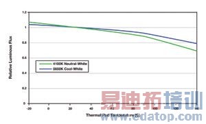 图2 随着热衬垫(外壳)温度的增加,光的相对输出量会降低