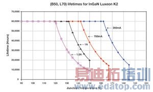 图1 随着电流的增大,需要更低的结点温度才能实现更长的工作寿命