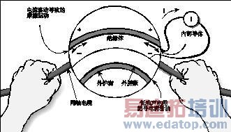 图14. 将SMU连接至保护吸盘上的器件 图14b中的连接是不正确的,它将SMU的Force LO端子连接至高阻栅极,将SMU的Force HI端子连接至保护吸盘。在这种情况下,共模电流将通过SMU以及DUT。这会造成测量不准确,甚至不稳定。 VIIII摩擦效应摩擦电流是由于导体和绝缘体之间摩擦产生的电荷形成的。自由电子由于摩擦离开导体,造成电荷不平衡,由此产生电流。这种噪声电流可达到数十nA。图15所示为摩擦电流的流向。 吉时利4200-SCS配备的三轴电缆在外屏蔽的下方采用了浸渍石墨绝缘体,大大降低了这种影响。石墨提供了润滑和导体柱,均衡了电荷,并将电缆运动的摩擦效应产生的电荷降至最小。然而,即使这种类型的三轴电缆在受到振动和膨胀或收缩时,也会产生噪声。因此,所有连接应尽量短,避免温度变化(将产生热膨胀力),最好将电缆绑到不振动表面,例如墙、桌子或刚性结构。