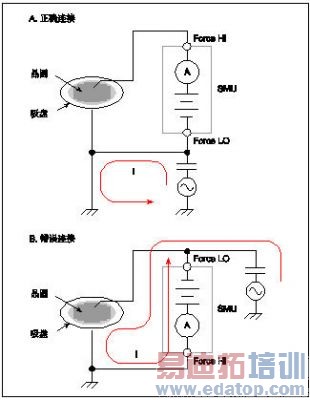 图13. 使用同轴电缆和三轴电缆测量高阻的结果比较 从图13可知,利用带有保护的三轴电缆进行测量,漏流较小(低几个pA),建立时间更短(大约快10倍)。如果SMU必须连接至采用BNC连接器的测试夹具,请在SMU和测试夹具之间使用吉时利三轴电缆,然后再将BNC连接至三轴适配器(去掉了保护),从而将电缆连接至测试夹具。 VIII SMU至DUT的连接连接DUT时,除了使用屏蔽和保护电缆,将吉时利4200-SCS的相应端子与装置的合适端子相连接也非常重要。SMU的Force HI和Force LO端子连接不合适会导致电流偏移和测量不稳定。这些误差是由于共模电流产生的。 通常情况下,总是将SMU的高阻端子(Force HI)连接至被测电路的最大电阻点。同样,总是将4200-SCS的低阻端子(Force LO)连接至被测电路的最小电阻点。最小电阻点可以是公共端子或接地。如果Force HI端子被连接至最小电阻点,共模电流就会通过测量电路。 图14中标出了正确和不正确的测量连接。图14a中的连接是正确的,因为吉时利4200-SMU的Force HI端子被连接至晶圆上器件的栅极,而Force LO端子被连接至带有保护的吸盘。晶圆上的栅极端子为最大阻抗点,保护吸盘为低阻抗点,所以该电路的连接正确。请注意,共模电流从SMUde Force LO端子流至保护吸盘;然而,电流并不通过安培计,因此不会影响测量。