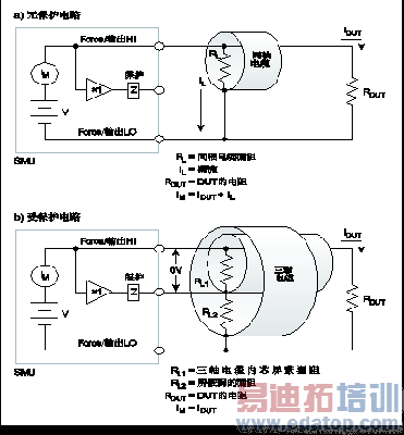 VII 漏流和保护II保护亦可用于减小电缆连接中的漏流。图12所示为驱动保护防止电缆的漏泄电阻影响小电流测量的原理.在无保护的配置中,同轴电缆的漏阻与DUT并联(RDUT),产生不希望的漏流(IL)。该漏流将影响极小电流的测量。在保护电路中,三轴电缆的内芯屏蔽被连接至SMU的保护端子。现在,该屏蔽由一个单位增益低阻放大器(保护)驱动。Force HI端子和保护端子之间的电势差接近0V,所以漏流(IL)可忽略不计。