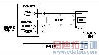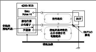 图17. 污染和湿度造成的电流 为避免污染和湿度的影响,请选择防吸水的绝缘体,并将湿度保持在适当水平(理想<50%)。此外,请使测试系统中的全部组件和测试夹具保持清洁,避免污染。 接地环路接地环路会产生杂散信号,可能是直流偏移或交流信号(通常为工频或工频的整数倍)。接地环路时由于测试电路中多处接地造成的。当大量仪器插入至不同仪器架上的电源接线板时,就会形成典型的接地环路。接地点之间的电势往往存在微小差异,由此就会产生大电流循环,从而形成意料之外的电压降。 图18中所示的配置就是一个接地环路,是因为将4200信号公共端子(Force LO)和DUT LO均连接至地形成的。环路中的大接地电流通过的是小电阻,无论是导体还是在连接点。该小电阻产生的压降会影响性能。为避免接地环路,测试系统应单点接地。如果不能消除DUT的地,那么4200的GNDU COMMON端子和机箱地之间的接地链路应断开,如图19所示。