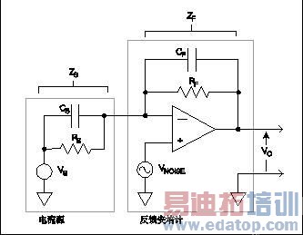 图20. 反馈安培计的简化模型 RF =反馈电阻CF =反馈电容电路的噪声增益可由下式给出: