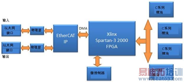 NI 9144扩展机箱由多个硬件组件构成,使得确定性分布式I/O成为可能。每个从机箱都带有两个以太网接口,用于接收EtherCAT数据包。这些数据包通过物理层传送到EtherCAT IP栈。EtherCAT IP包含了多个fieldbus内存管理单元(FMMU),用来正确地将EtherCAT数据映射到特定的从设备上。直接内存访问(DMA)在EtherCAT IP和C系列I/O模块之间传送同步I/O数据。Xilinx FPGA作为C系列模块接口,根据来自EtherCAT的指令和定时,用循环的方式处理I/O读和写。微控制器管理在主设备和从设备之间的任何异步消息,并且管理不同硬件组件的配置任务。