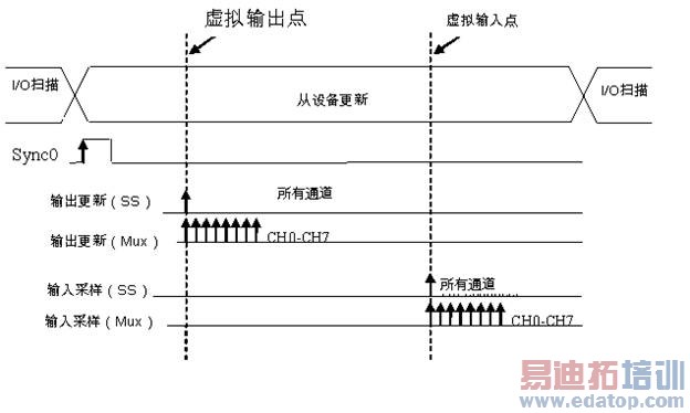 主控制器还使用Sync0对齐"虚拟点",这是所有从机箱对各自的I/O进行更新的精确时间点。由于NI扫描引擎作用于单点数据,虚拟输出点已经经过优化以便最快地获取输出模块的更新,虚拟输入点已经过优化以提供输入模块的最新采样。在这种模式下,在个别通道之间的更新只会出现很小的抖动,这对于控制应用而言是十分理想的。对于含有多路复用I/O的模块而言,输入在每个周期中都会包含一定的延迟,因此通道0读数相对于下一个通道0读数而言,会有相同的偏差值。此外,同步采样模块对于所有使用的相同模块都在准确的相同时间进行I/O通道更新,即使使用不同的模块,也可达到最小的相位偏移。假设在从设备更新中,每个从设备采样发生在两个相同的虚拟点上,那么对于所有网络上的NI 9144从设备的输出和输入都会有同步的开始时间。